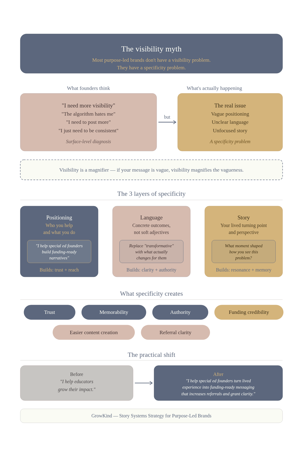 Specificity isn't a branding tweak you do once and forget. It's a structural decision. When your story is specific at every layer: positioning, language, and lived experience, it becomes the foundation that everything else is built on.